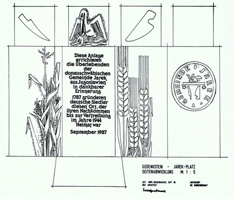 Der Gedenkstein selbst wurde von unserem Jareker Architekten Franz Morgenthaler aus Nürtingen entworfen, und er war auch als Bauleiter für die Durchführung des Bauantrages sowie der anschließenden Arbeiten am “Jarek Platz“ verantwortlich. Das geplante Muster des Gedenksteines wurde allen Jarekern mit dem Spendenbrief übermittelt. Hinzuzufügen blieb lediglich noch, dass auf dem oberen kleinen Quader der freien Seite ein kleines Kreuz und der Zusatz kommt: “Wir gedenken unserer Toten!“ Damit sind unsere toten Angehörigen gemeint, die in Jarek bis 1944 beerdigt wurden, damit sind unsere gefallenen und vermissten Söhne gemeint, unsere auf der Flucht umgekommenen Jareker, aber auch alle diejenigen, die in der neuen Heimat ihre ewige Ruhe gefunden haben. Und selbstverständlich denken wir dabei auch an alle unsere donauschwäbischen Brüder und Schwestern, die nach 1944 nach Jarek ins Lager kamen und dort auf grausame Weise ums Leben gekommen sind (siehe hierzu auch die Seite: “Das Lager Jarek").