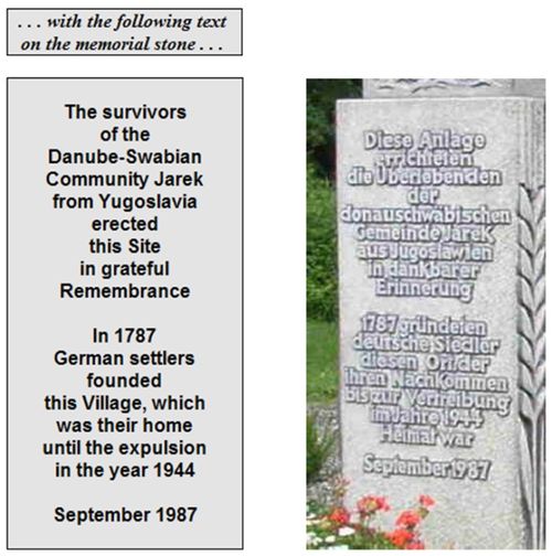 Die Jareker ließen sich nach der Flucht nach Deutschland wieder dort nieder, woher ihre Ahnen einst ausgewandert waren, aber auch in Amerika, Kanada und Österreich. Ca. 30 Familien kamen nach Beuren. Es wurde ihre neue Heimat. Hier trafen sich nun bald Jareker aus der ganzen Weit zu ihren jährlichen Ortstreffen. Bei der 200 Jahrfeier im Jahre 1987 übernahm die Gemeinde Beuren die Patenschaft über die Jareker, und es wurde ein Gedenkstein auf dem „Jarek-Platz" am Eingang des Friedhofs errichtet, der an die alte Heimat und auch an ihre Toten erinnern soll.