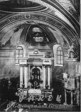 The first house of God in the village of Jarek was erected in 1791 by the so-called “Kameral” authority and did not differ in any way from the other houses in the village. It consisted of air-dried bricks and was 10 klafters long and 3.5 klafters wide. It was situated in the place of' the later churchyard at the crossing of the Hauptgasse (Main Lane) and the Kreuzgasse (Cross Lane). Beside it a simple bell tower for the Josef’s bell, a present form Emperor Josef, was built.