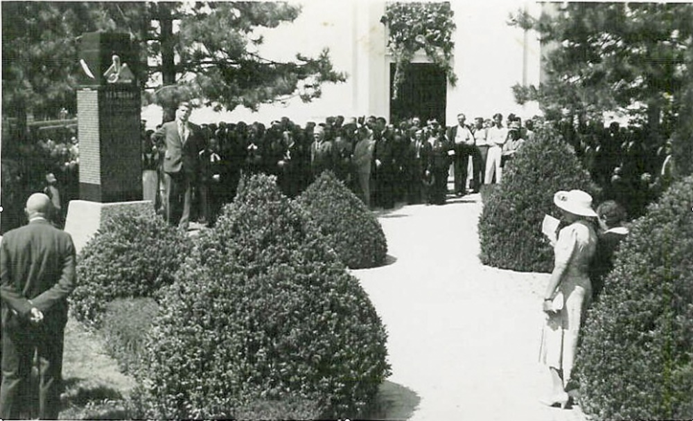 The crowning event in the arrangement of the churchyard was finally the erection of the Ancestors' Monument made of black marble. It was also financed by donations. At the 150th anniversary in 1937 it was meant to commemorate the 80 settler families who had come from Ruma to Jarek in 1787 (“Link to: Winter at Ruma”). On its upper part it was decorated on all sides by the arms of the village, the pelican, the ploughshare and the coulter. The pelican is a symbol of the many sacrifices the villagers had to make again and again in the course of their history. With the help of the ploughshares and their unremitting diligence they had nevertheless managed to obtain such good crops on the fertile soil of the Pannonian Lowlands that in the end they were able to establish a solid existence after all the setbacks in the century before.