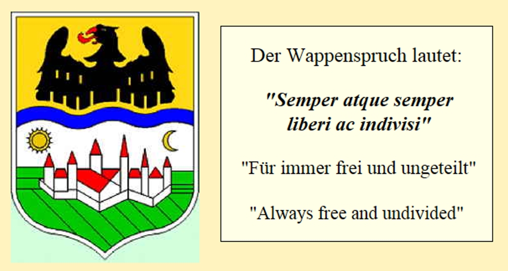 Dargestellt wird im oberen Teil ein rot bewehrter aufsteigender schwarzer Adler auf goldenem Grund. Geteilt durch einen blauen Wellenbalken ist in der unteren Hälfte auf grünem Ackerboden eine sechstürmige weiße Festung aus Ringmauer und rot bedachten Gebäuden zu erkennen. Darüber “rechts” (vom Betrachter aus links) am weißen Horizont die strahlend aufgehende Sonne und “links” (vom Betrachter aus rechts) der abnehmende Halb-Mond.