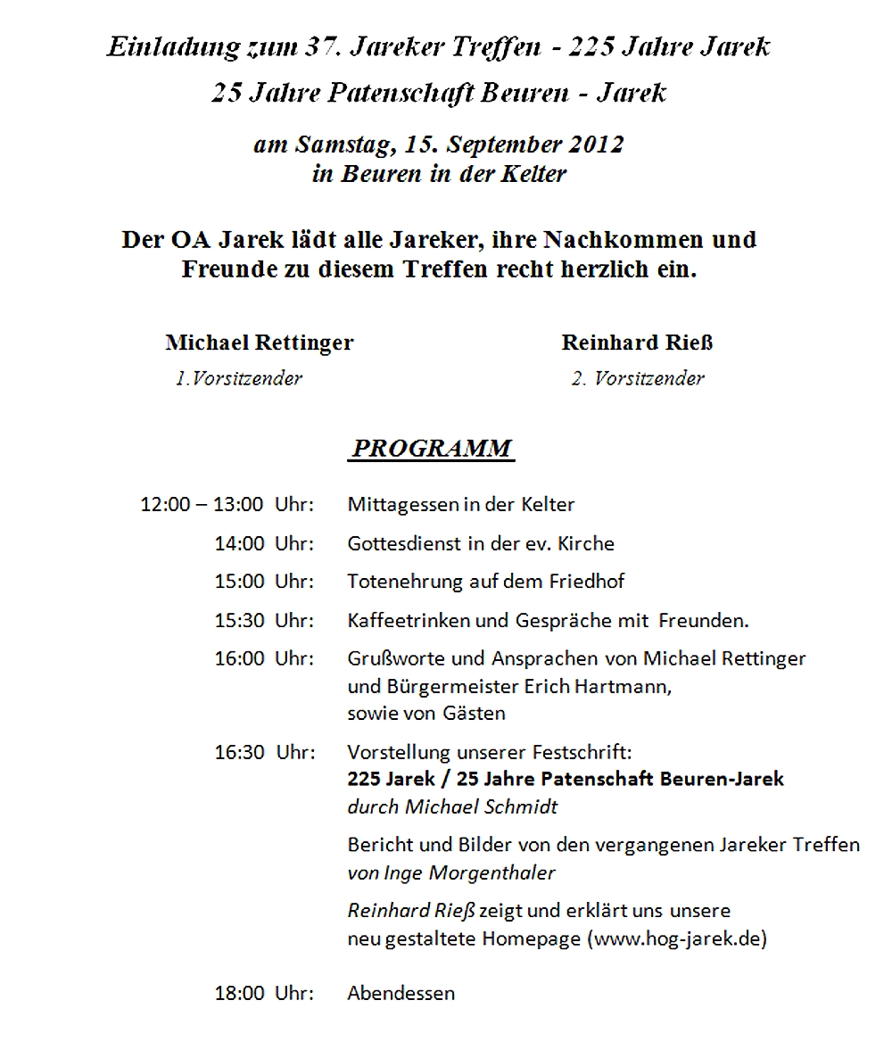 Einladung zum 37. Jareker Treffen am 15.09.2012 in Beuren