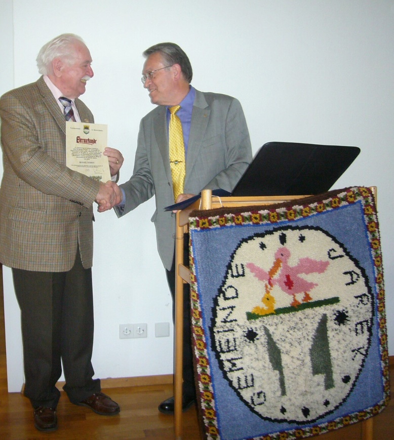 Im Anschluss an seinen Bericht überreichte Hans Supritz dem 1. Vorsitzenden des OA Jarek, Michael Schmidt, die Goldene Ehrennadel der Landsmannschaft der Donauschwaben, die für besondere Verdienste an den donauschwäbischen Landsleuten verliehen wird. Michael Schmidt hat sich diese Ehrung redlich verdient durch seine über 50 jährige Tätigkeit im Dienste der Donauschwaben. Die Jareker gratulieren sehr herzlich und freuen sich mit ihrem 1. Vorsitzenden.