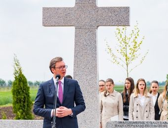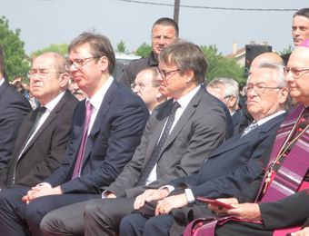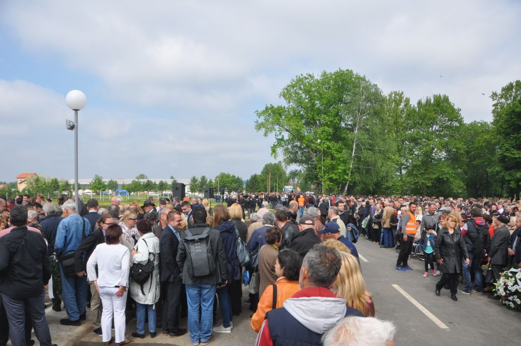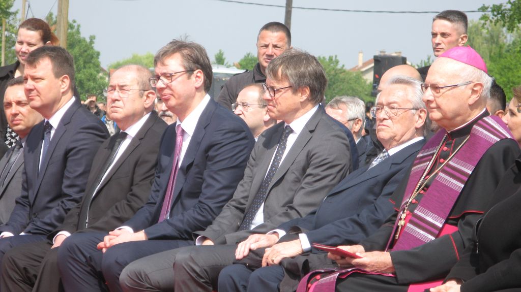 Nach der Besichtigung des Gemeindehauses fuhr uns unser Bus die Kreuzgasse hinunter zur  Gedenkstätte am Dorfrand. Wir staunten sehr, als wir die Menschenmassen und die vielen Autos sahen, die rechts und links auf den Grünstreifen neben der Straße geparkt waren. Aus mehreren Bussen stiegen viele junge Leute aus. Unser Bus durfte nur  weiterfahren, weil das Kennzeichen  angemeldet war.  Vom Dorfende bis zum Parkplatz vor der Gedenkstätte standen Absperrungen am Rand der neu geteerten Straße und dahinter drängten sich die Menschen, die von Ordnern eingewiesen wurden. Viele  Kamerateams und Reporter mit Mikrophonen suchten sich zwischen den noch leeren Stuhlreihen, die man für die Ehrengäste aufgestellt hatte, einen günstigen Standort. Diese füllten sich langsam, als immer mehr Personen aus schwarzen Limousinen ausstiegen und ihre gekennzeichneten Plätze einnahmen. Auch die Zahl der Zuschauer stieg um uns herum an, so dass die Straße völlig blockiert war. Diese Vorkehrungen waren  notwendig, weil eine große Zahl von hochrangigen Gästen zur Feier angekündigt waren, darunter  Ministerpräsident  Aleksander Vucic und der Deutsche Botschafter Axel Dittmann.