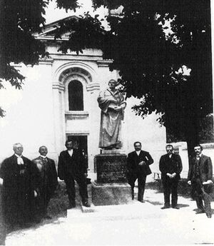 In the following years money was collected for a wrought-iron enclosure of the churchyard. One year later, in 1912, the curator Georg Reichert and his wife donated the Luther Monument in remembrance of their deceased daughter Theresia. It was made of terracotta in life-size and placed on a cast stone pedestal 1.20 m. high. A year afterwards a small patch with box trees was arranged round the monument.