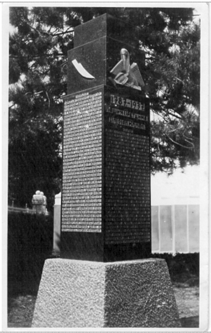 The crowning event in the arrangement of the churchyard was finally the erection of the Ancestors' Monument made of black marble. It was also financed by donations. At the 150th anniversary in 1937 it was meant to commemorate the 80 settler families who had come from Ruma to Jarek in 1787 (“Link to: Winter at Ruma”). On its upper part it was decorated on all sides by the arms of the village, the pelican, the ploughshare and the coulter. The pelican is a symbol of the many sacrifices the villagers had to make again and again in the course of their history. With the help of the ploughshares and their unremitting diligence they had nevertheless managed to obtain such good crops on the fertile soil of the Pannonian Lowlands that in the end they were able to establish a solid existence after all the setbacks in the century before.
