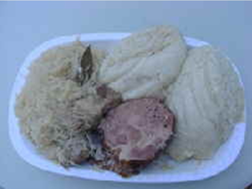 When the meat is tender, add water again. As soon as everything is cooking purlingly, place the dumplings on the kraut and cover with a tightly sealing cover. Turn down the stove and let the kraut cook on low heat for another ½ hour. (During this process do not lift the cover or the dumplings will crumple up). When the kraut smells somewhat burnt, the dish is done. It tastes especially good when reheated.