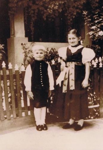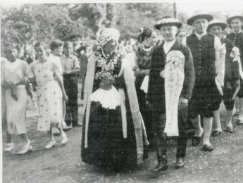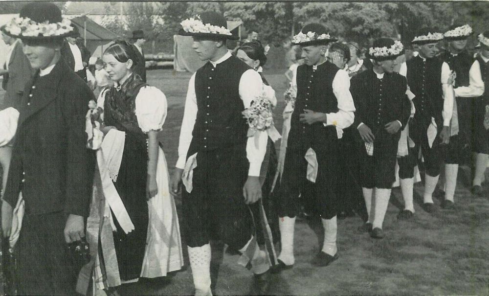 After lunch the great procession in traditional costumes took place. It was to be a “costume-wedding” procession in which only wearers of costumes could take part. All classes of ages, from child to grandfather and grandmother, were to portray the “wedding guests.” The “costume bride,” Resi Schurr, and the “groom,” Peter Wack, accompanied by the “bride’s men” and the “bride’s maids” went from village limits in the south through the “Hauptgasse” to the festival grounds. The remaining “wedding guests” followed after. In the festival tent a great costume festival took place, at which the child and adult wearers of costumes performed folk dances, including also the ribbon dance.